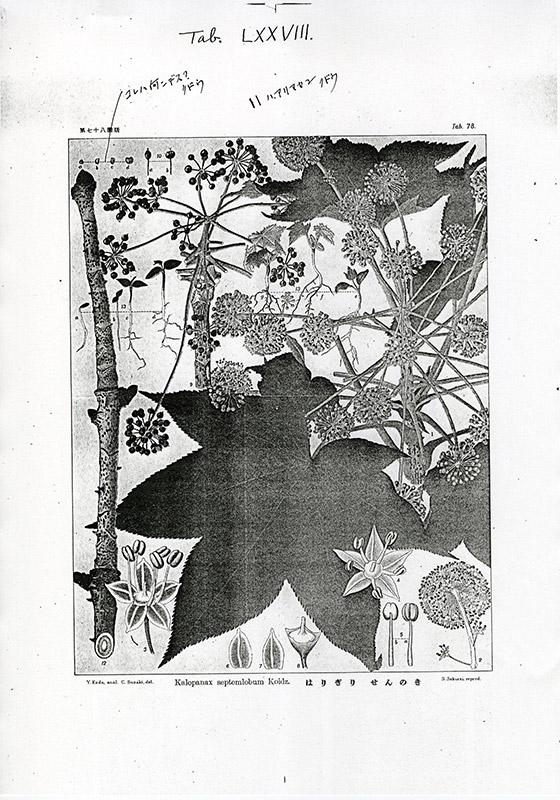 たとえば、秋月俊幸編『書簡集からみた宮部金吾』(北大出版会)の書籍カバーには「くろびいたや」「ちしまざくら」の図版修整指示を細かく書き込んだ校正紙がカット的に使われています。