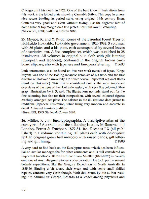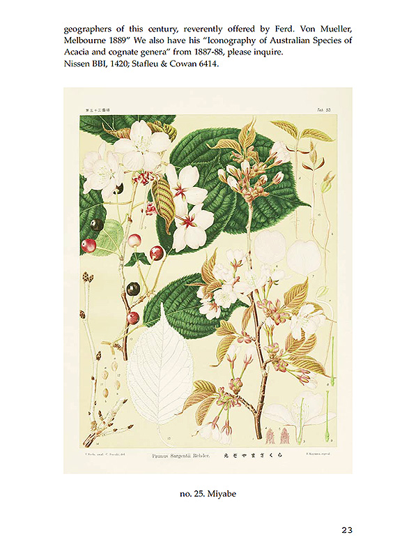 『北海道主要樹木図譜』の英文名は「Icones of the essential forest trees of Hokkaido」となっておりますが、ネットで海外の状況を調べていたところ、オランダ・アムステルダムにある古い博物図鑑などを専門とする古書店Dieter Schierenberg BVが製作した稀覯本販売カタログCatarogue 81に製本された『北海道主要樹木図譜』がリスティングされているのを見つけました。