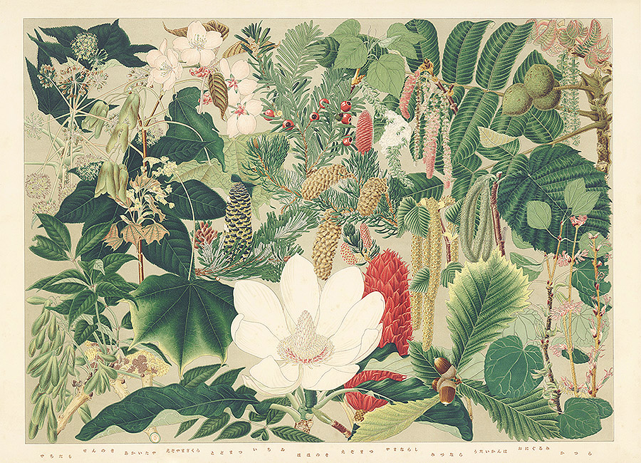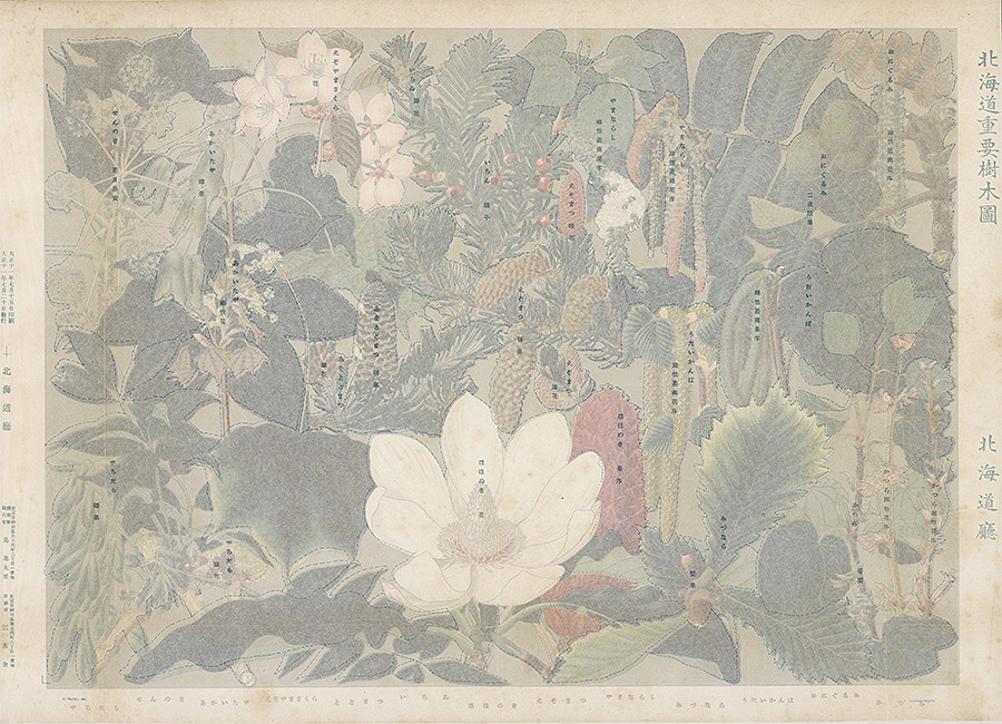 2011年弘南堂書店(札幌)で見た『北海道主要樹木図譜』(再版製本)には図版のような紙が折りたたまれており、開けてみるといままで見たことのない樹木をコラージュした石版画が出てきました。