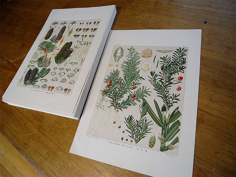 まず、基本単位となっているのは1樹種について1枚の絵と解説文(和文・英文)の一対の組み合わせで、これは絵が写真に置き換わった現代の図鑑類でも同様です。